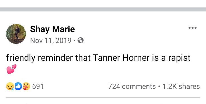 Shay Marie sheds a lot of light on the character of Tanner Horner. On November 11, 2019, she posted on Facebook saying “Friendly reminder that Tanner Horner is a rapist.”
